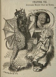 The image shows a devil, on the left hand side, scaring a man, on the right hand side. Behind the man is a capital letter D with an illustration showing the head of a man inside. There is a caption in the letter Mr. Tom Tiddler. The caption above the entire image says Chapter VII. Another happy day in town.