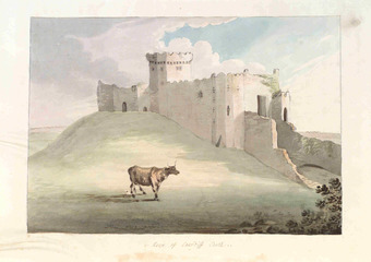 View of keep of Cardiff Castle, partially ruined, with cow.