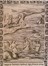 Three sirens waist-deep in water, playing musical instruments, watched by three harpies on shore, surrounded by human bones. In the background are a sinking ship and an islet covered in bones.