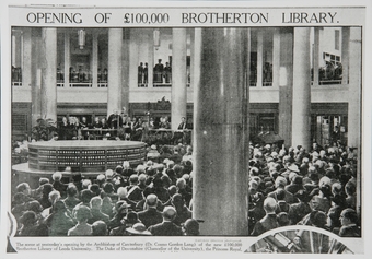 Newspaper photograph with headline 'Opening of £1000,000 Brotherton Library'.